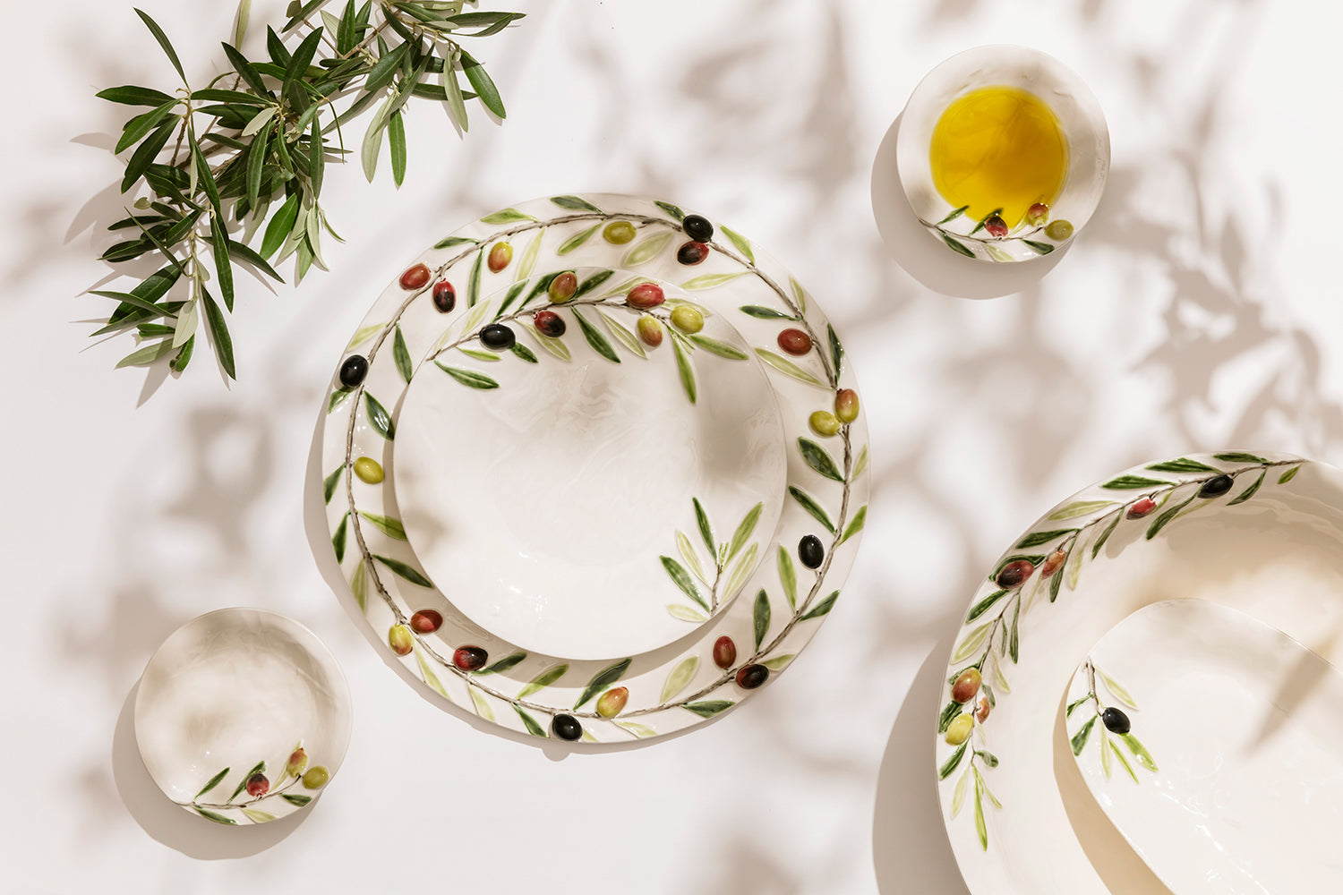 ハンドメイドでひとつひとつ丁寧に繊細に表現されたオリーブの実と枝葉。アートの様な美しいプレートたちがテーブルを彩ります。