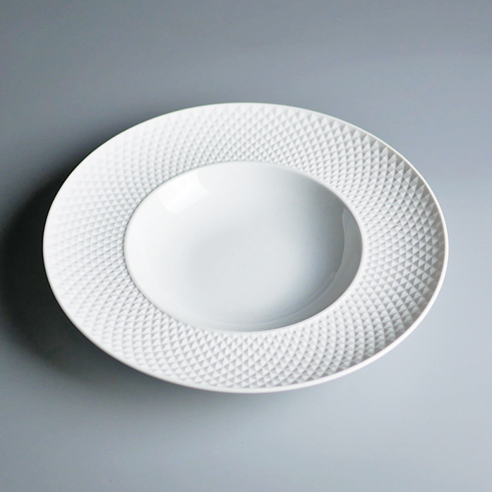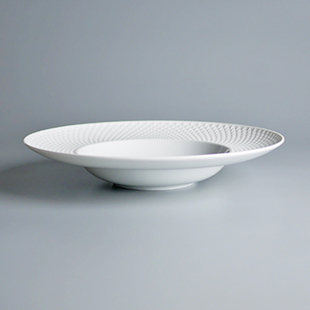 ヴィスタアレグレを象徴するBICOSグラスからインスパイアされたBICOSポーセレン。白磁の滑らかな肌と、マットな表面に細かいダイヤモンドポイントが浮き彫りされたリムとのコントラストが美しい、エレガントなテーブルウエアです。