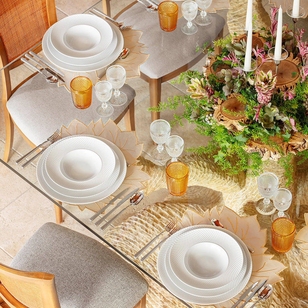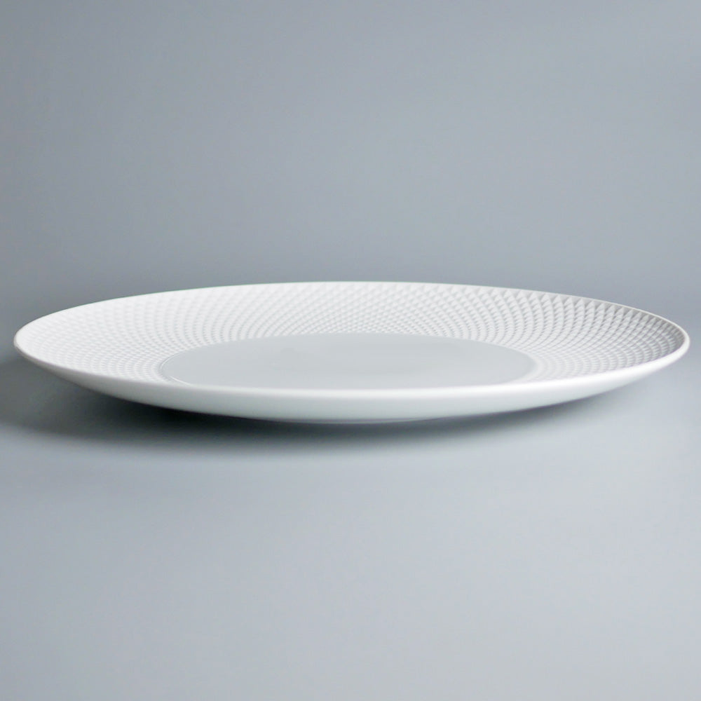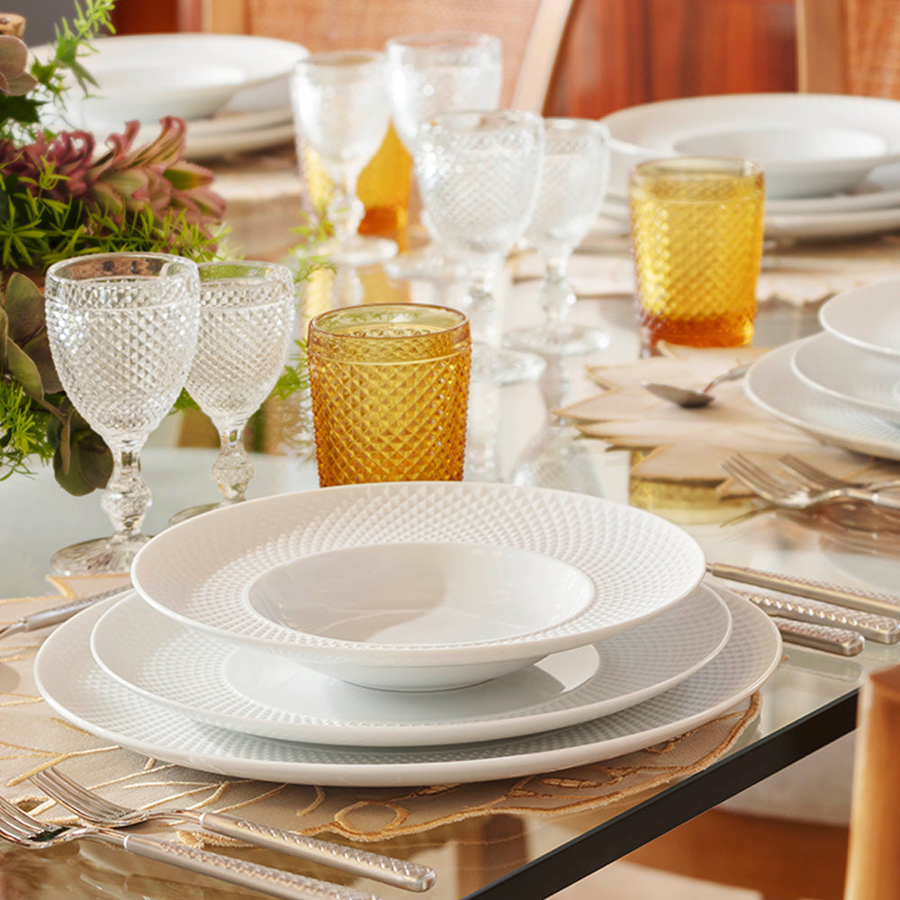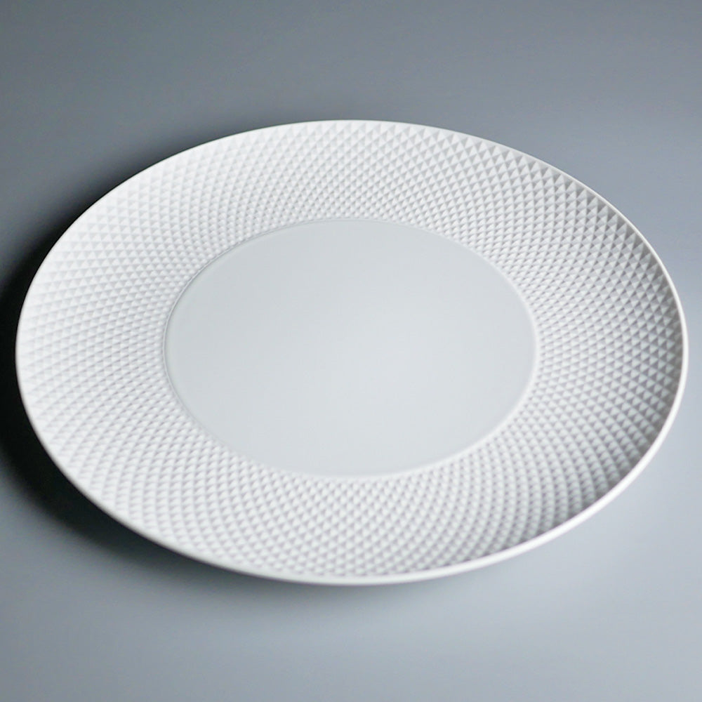 ヴィスタアレグレを象徴するBICOSグラスからインスパイアされたBICOSポーセレン。白磁の滑らかな肌と、マットな表面に細かいダイヤモンドポイントが浮き彫りされたリムとのコントラストが美しい、エレガントなテーブルウエアです。