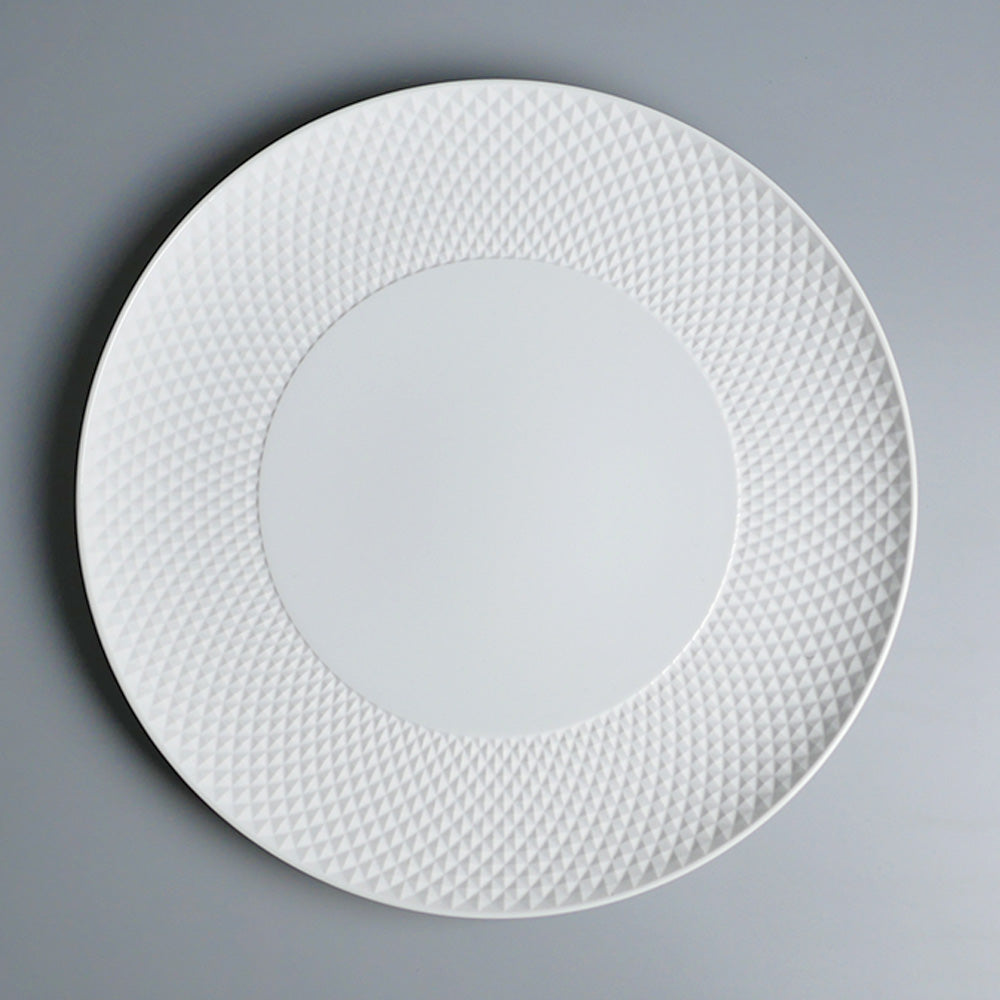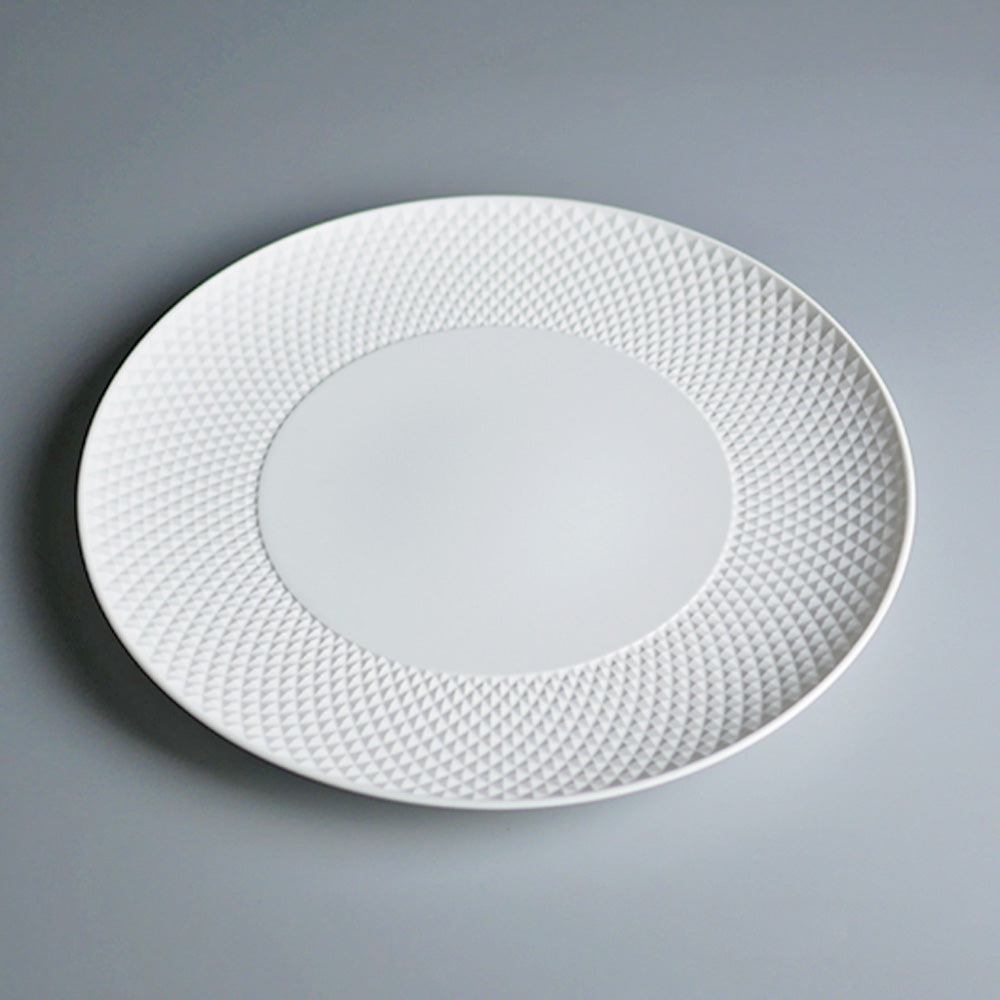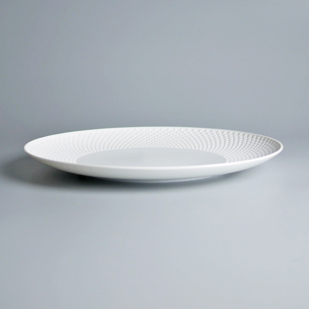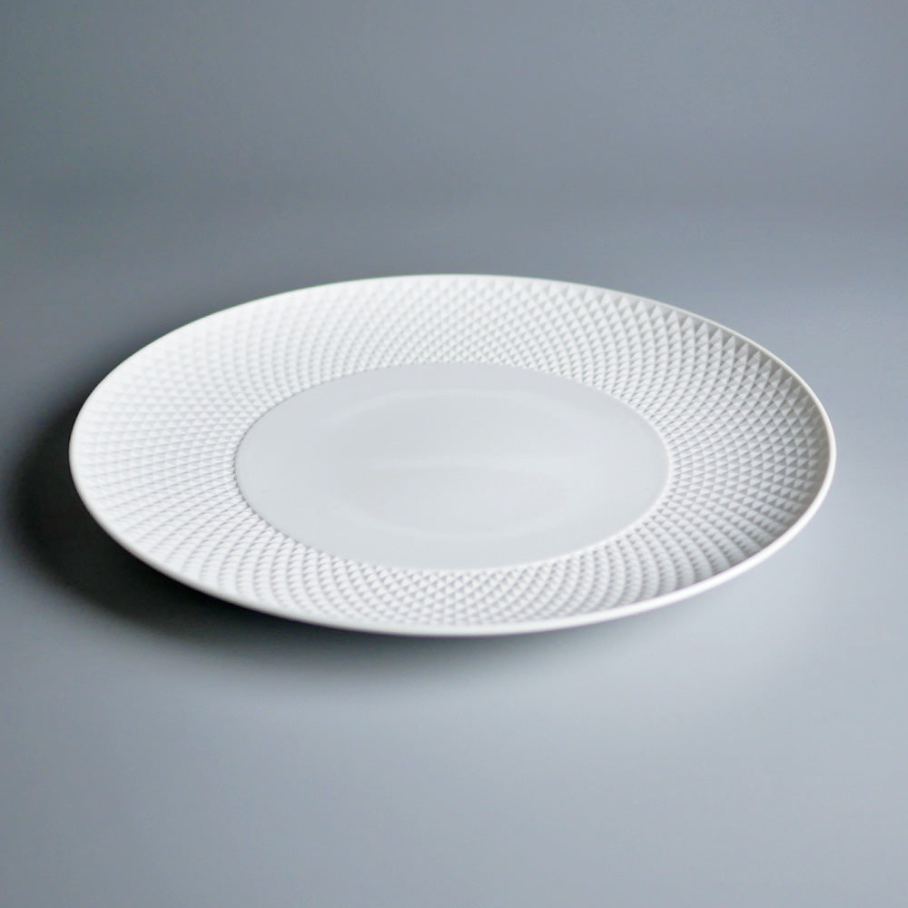 ヴィスタアレグレを象徴するBICOSグラスからインスパイアされたBICOSポーセレン。白磁の滑らかな肌と、マットな表面に細かいダイヤモンドポイントが浮き彫りされたリムとのコントラストが美しい、エレガントなテーブルウエアです。