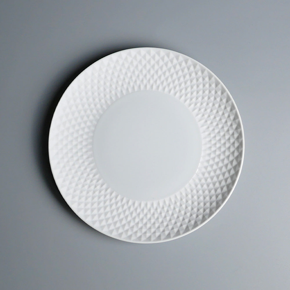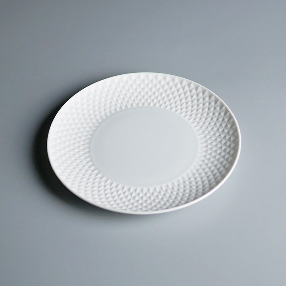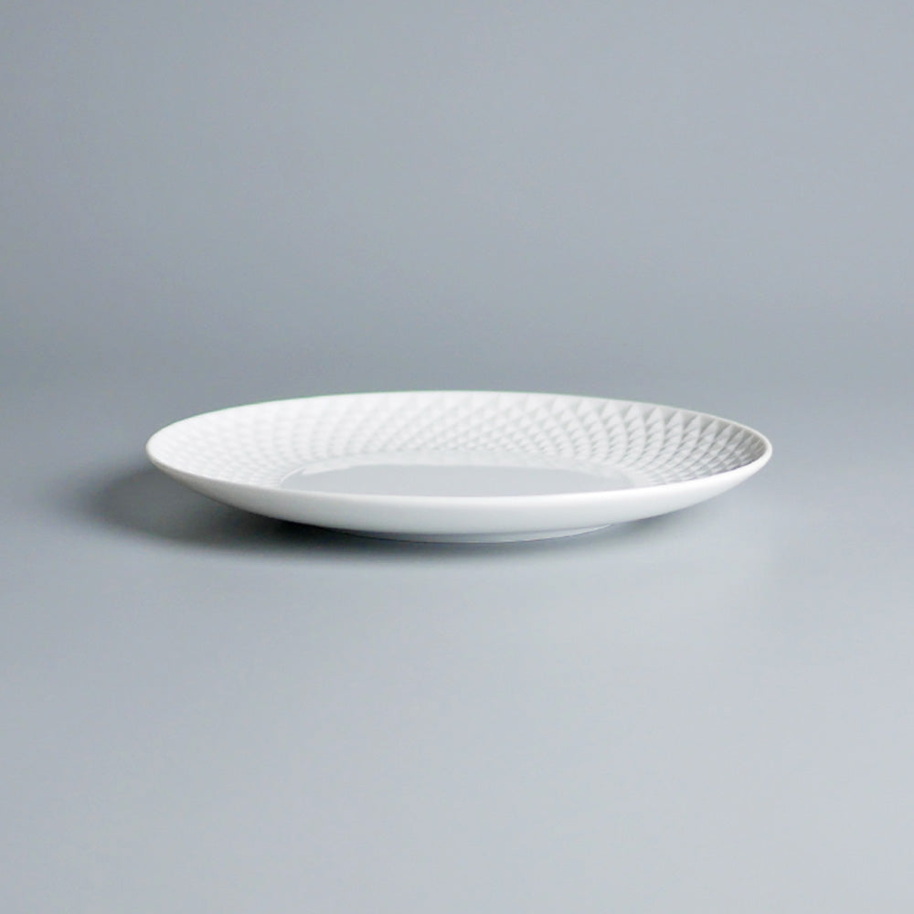 ヴィスタアレグレを象徴するBICOSグラスからインスパイアされたBICOSポーセレン。白磁の滑らかな肌と、マットな表面に細かいダイヤモンドポイントが浮き彫りされたリムとのコントラストが美しい、エレガントなテーブルウエアです。