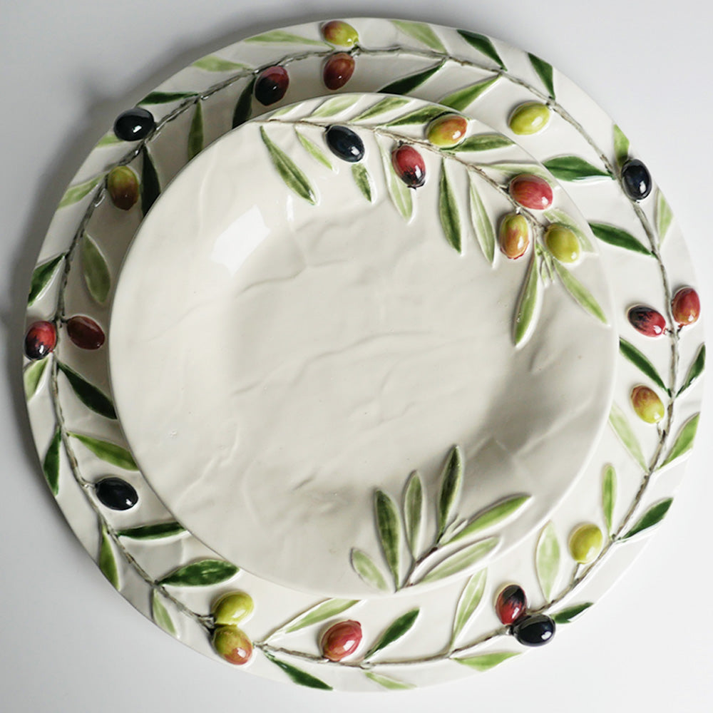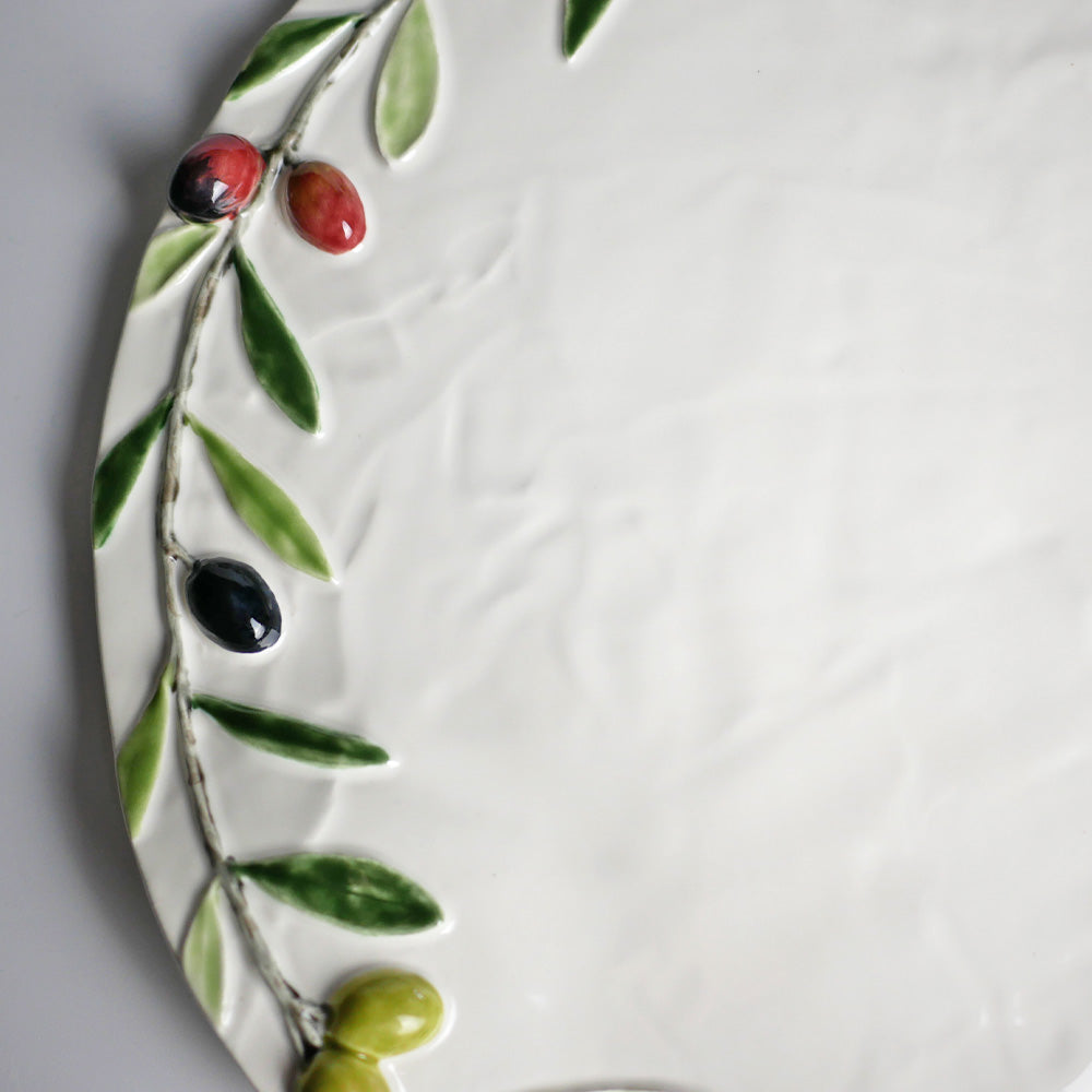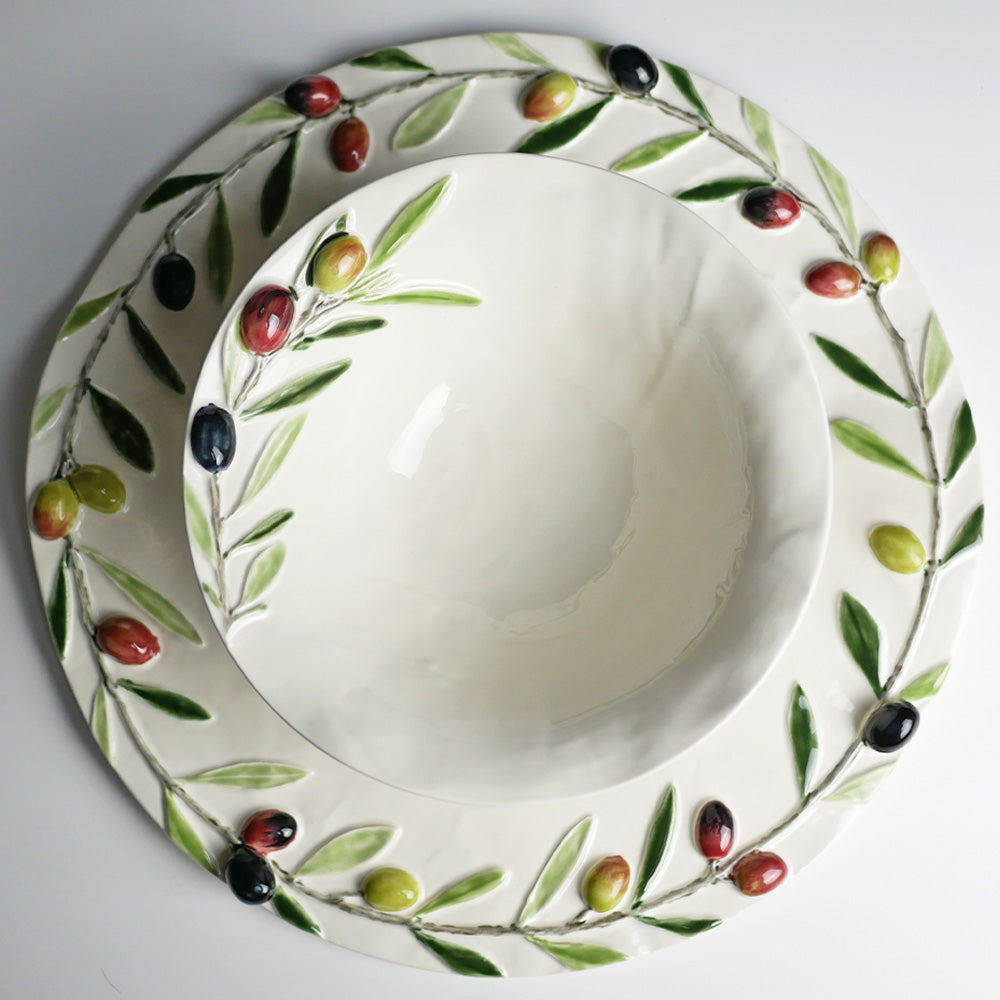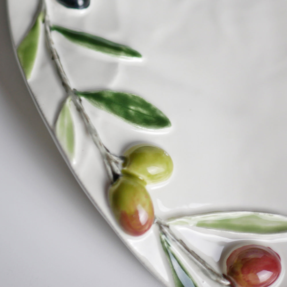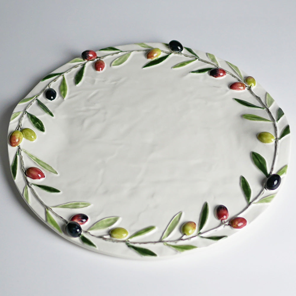ハンドメイドでひとつひとつ丁寧に繊細に表現されたオリーブの実と枝葉。アートの様な美しいプレートたちがテーブルを彩ります。