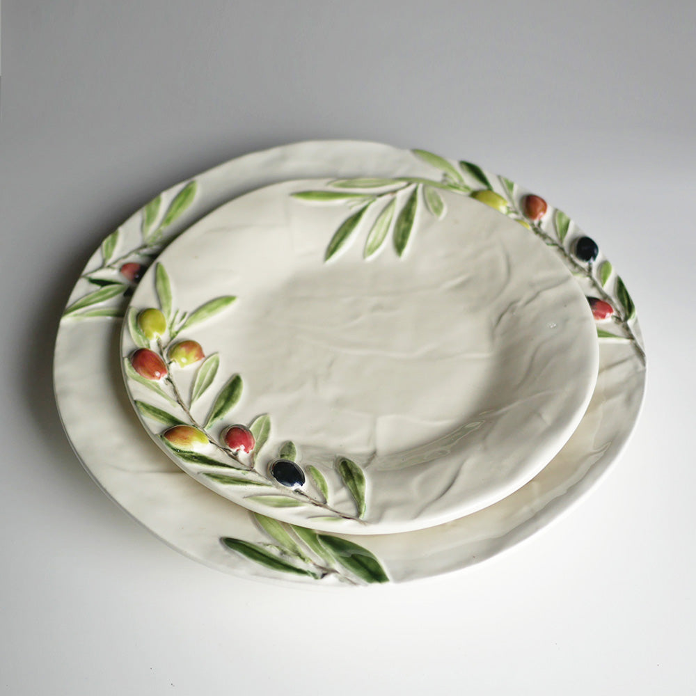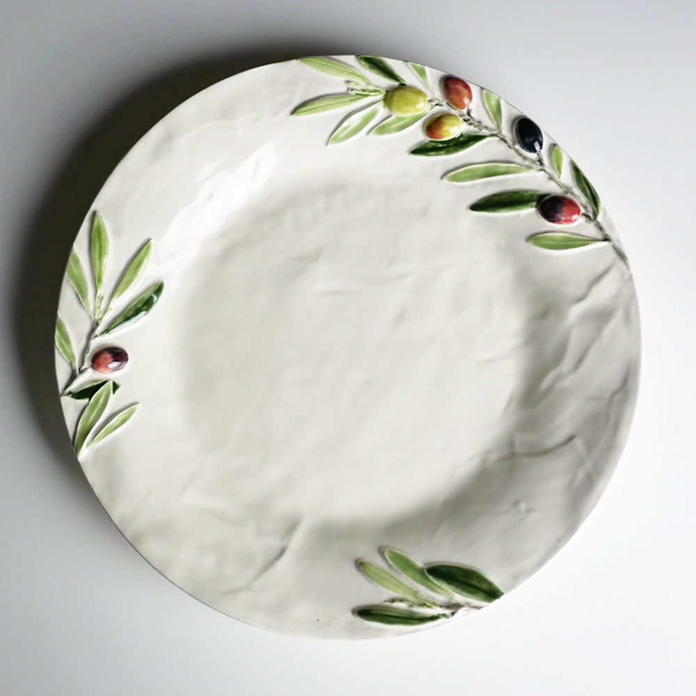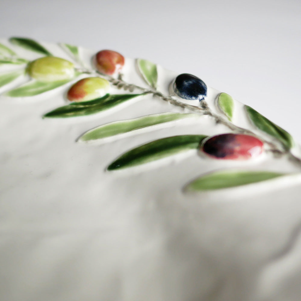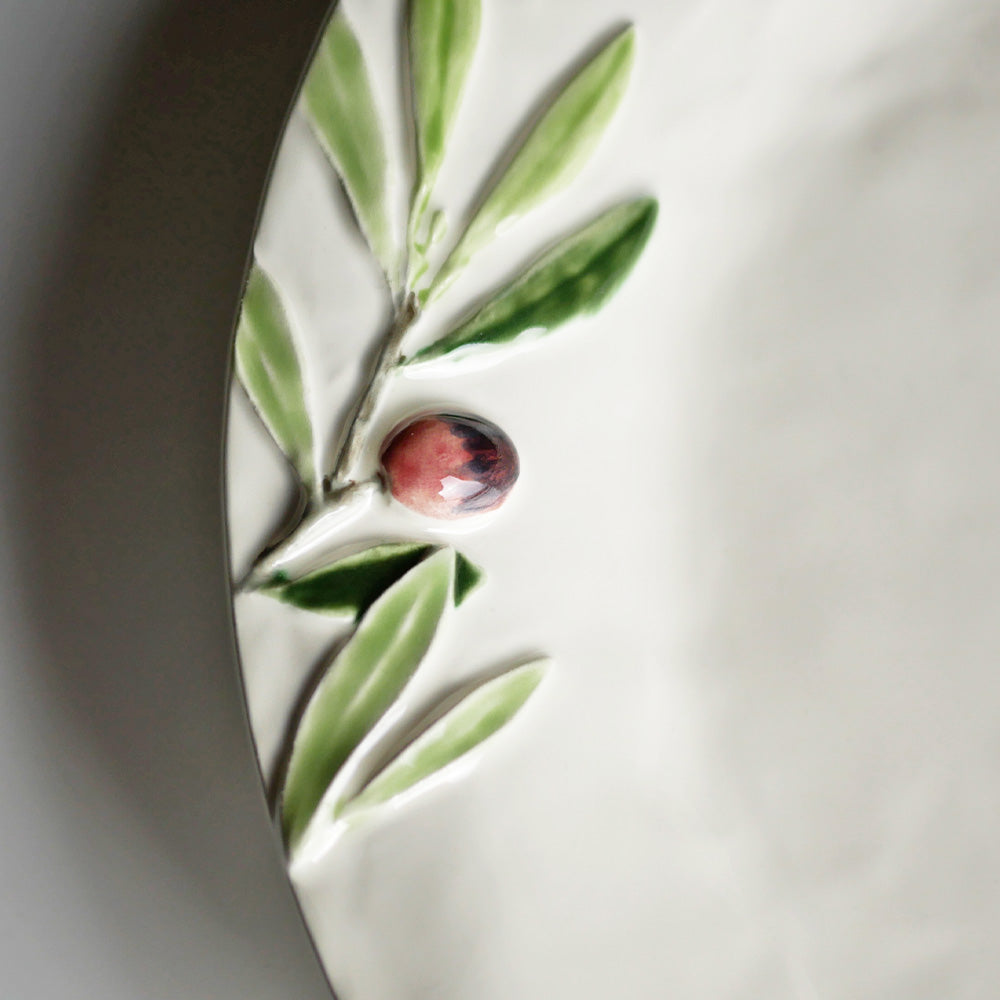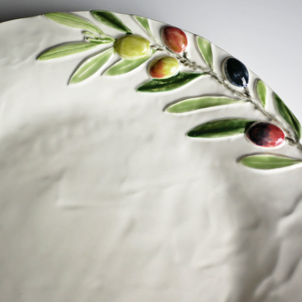 ハンドメイドでひとつひとつ丁寧に繊細に表現されたオリーブの実と枝葉。アートの様な美しいプレートたちがテーブルを彩ります。