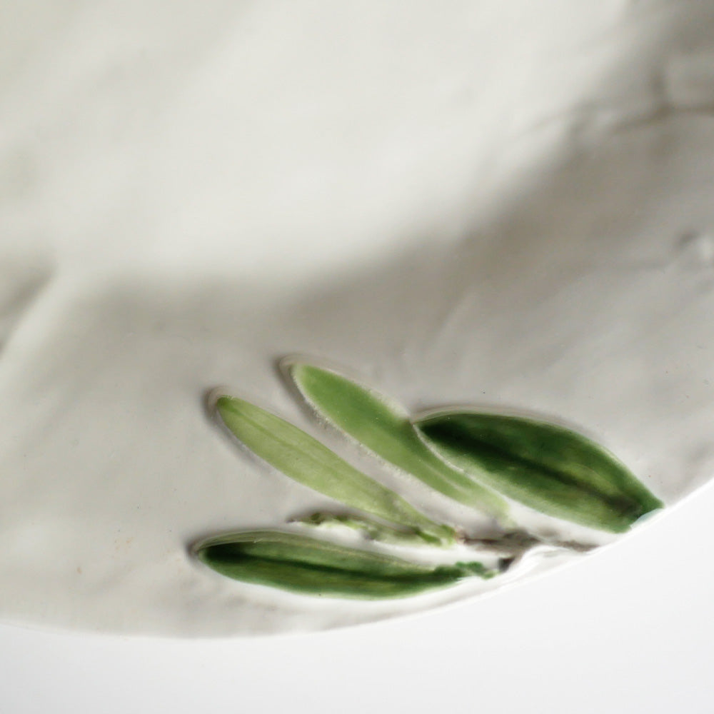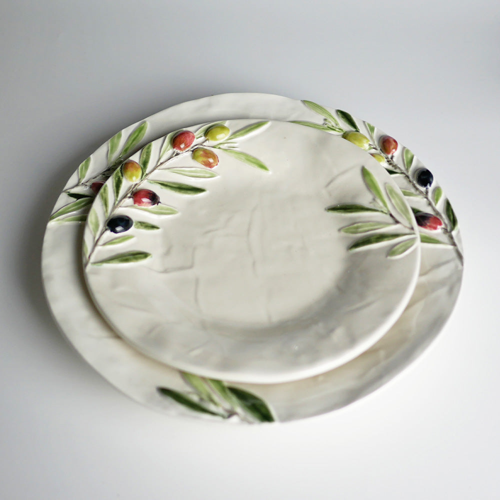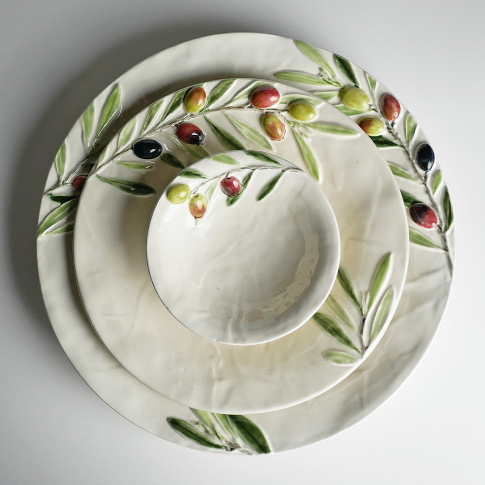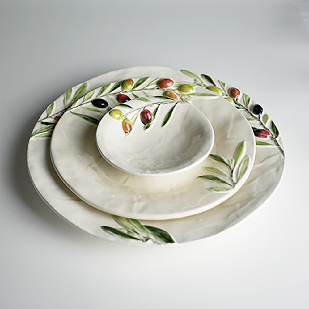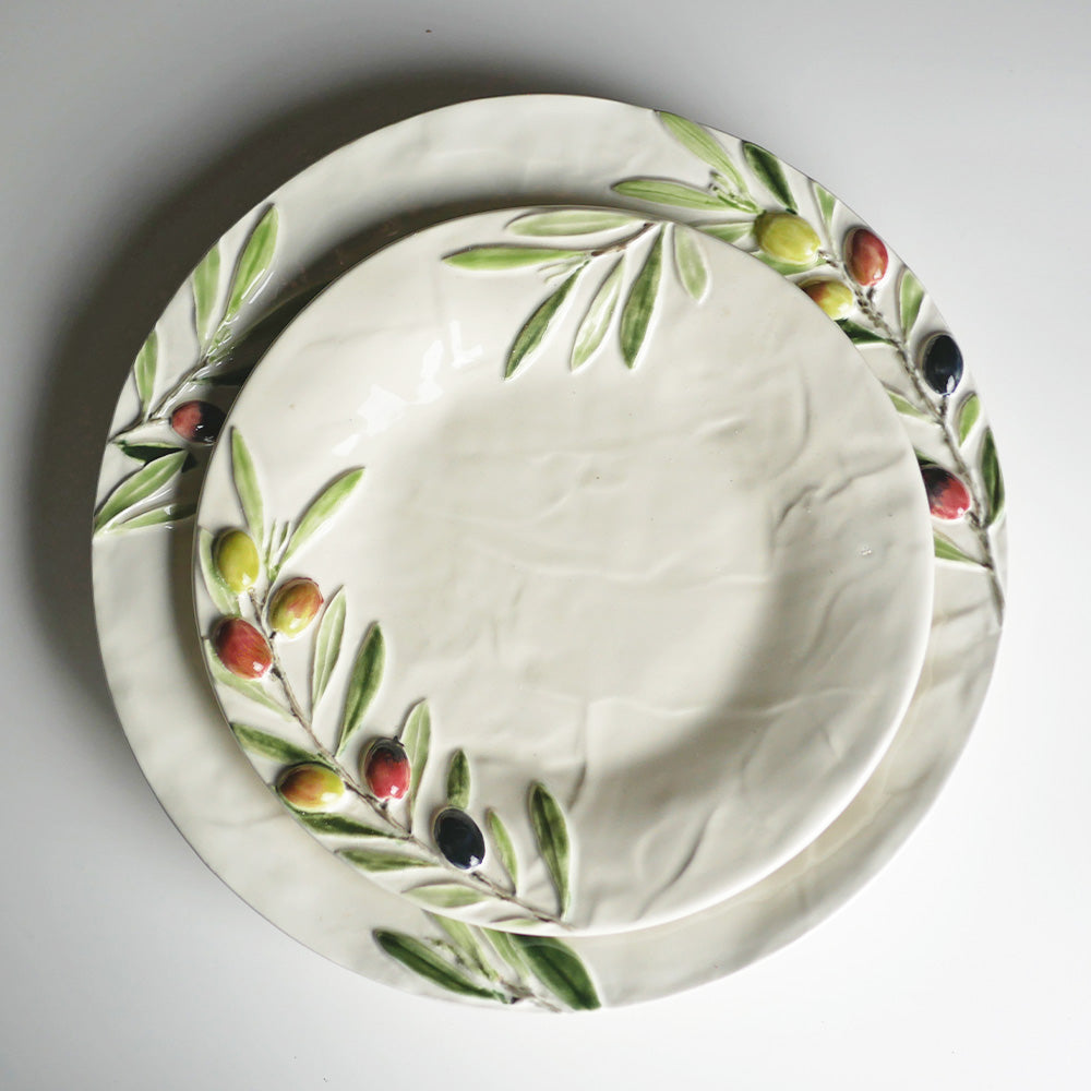 ハンドメイドでひとつひとつ丁寧に繊細に表現されたオリーブの実と枝葉。アートの様な美しいプレートたちがテーブルを彩ります。
