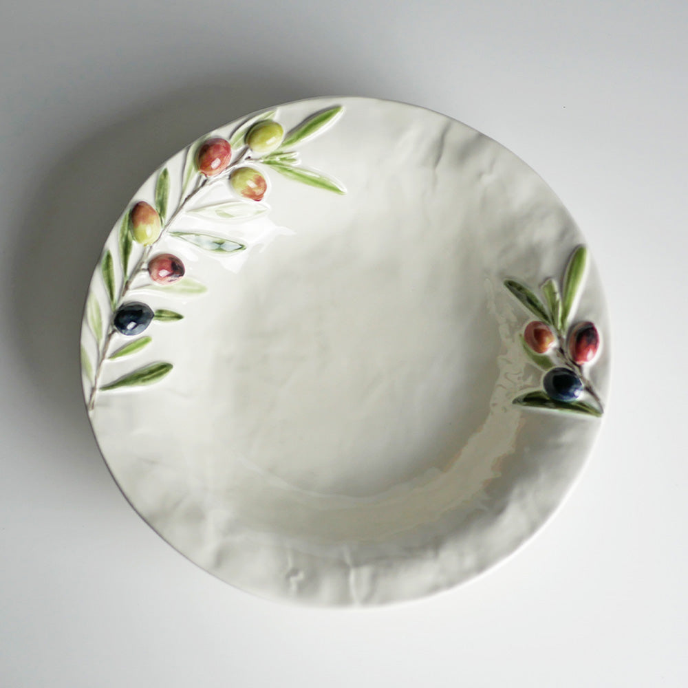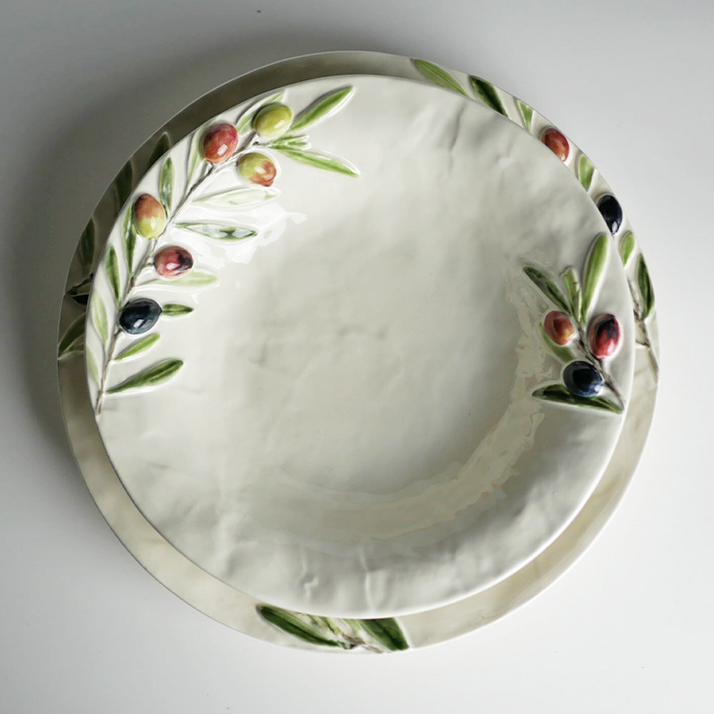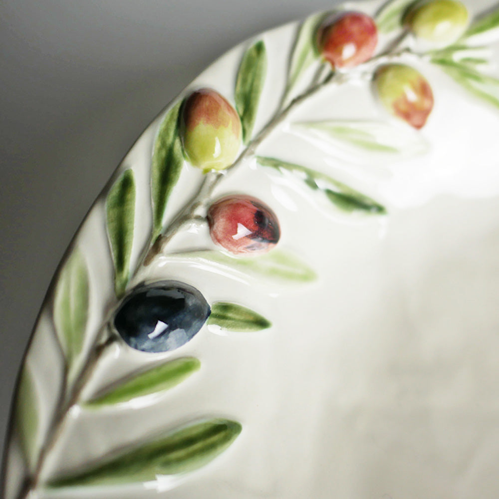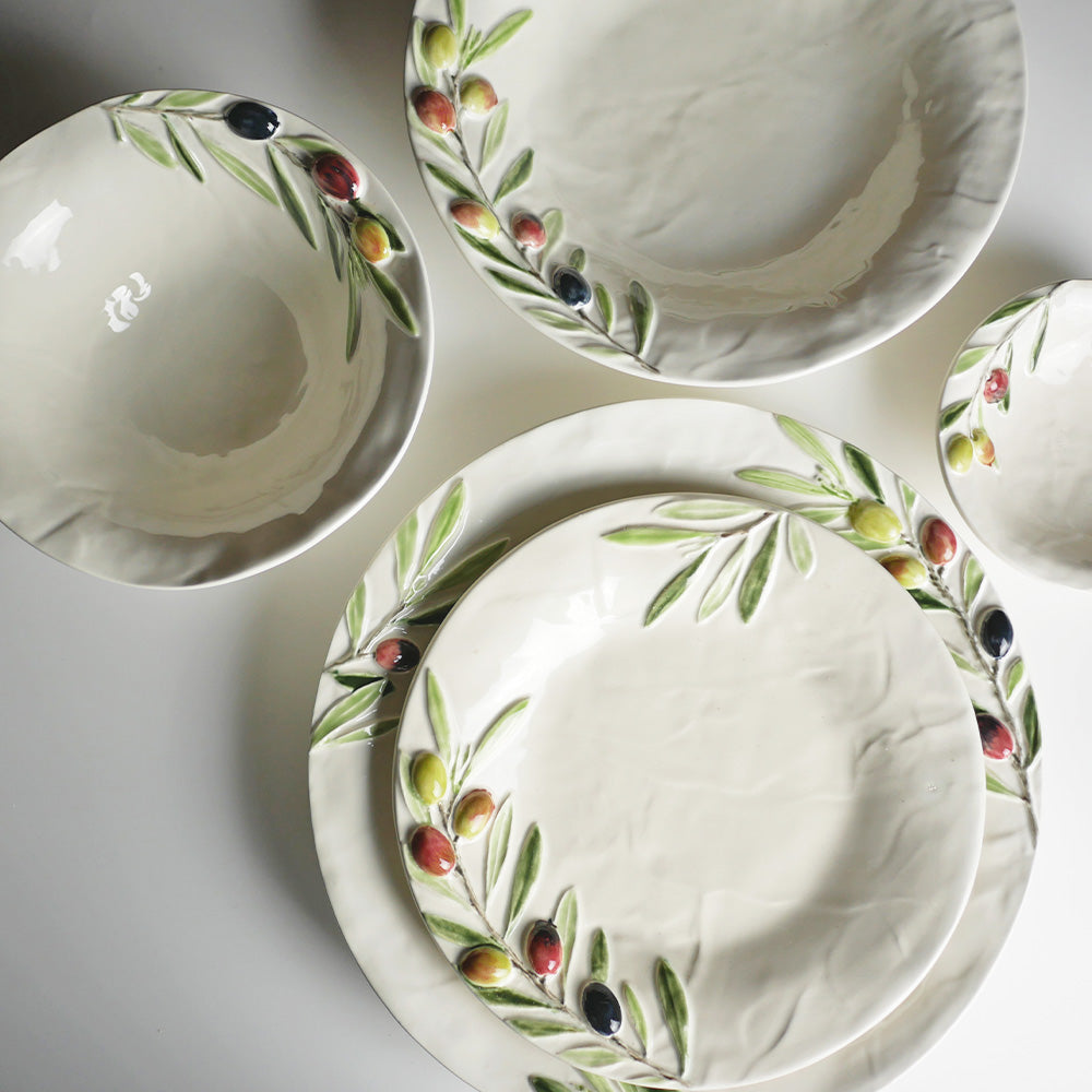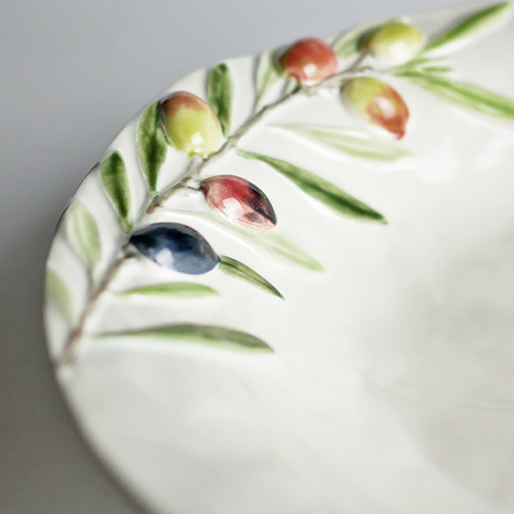 ハンドメイドでひとつひとつ丁寧に繊細に表現されたオリーブの実と枝葉。アートの様な美しいプレートたちがテーブルを彩ります。