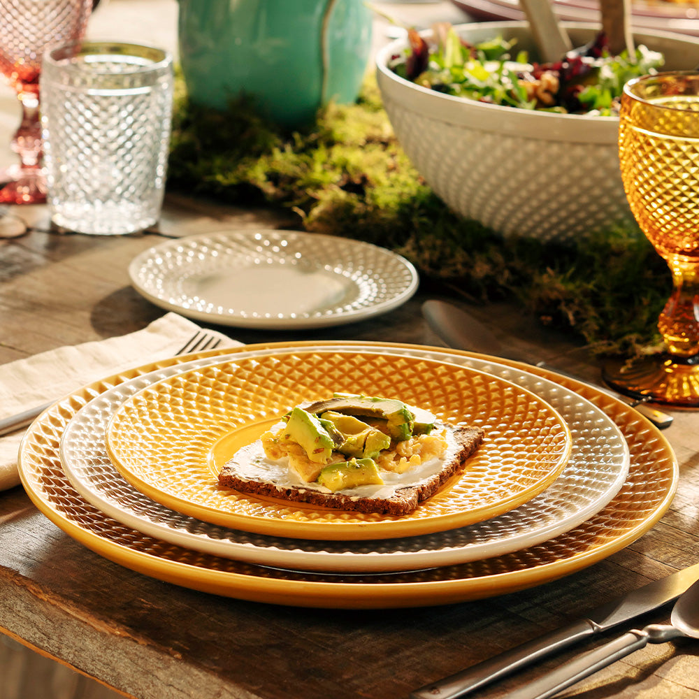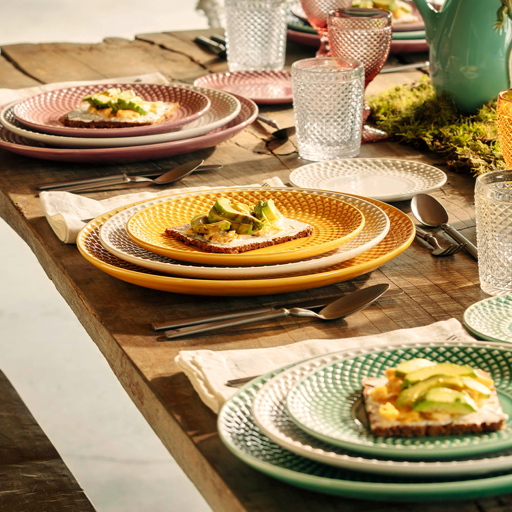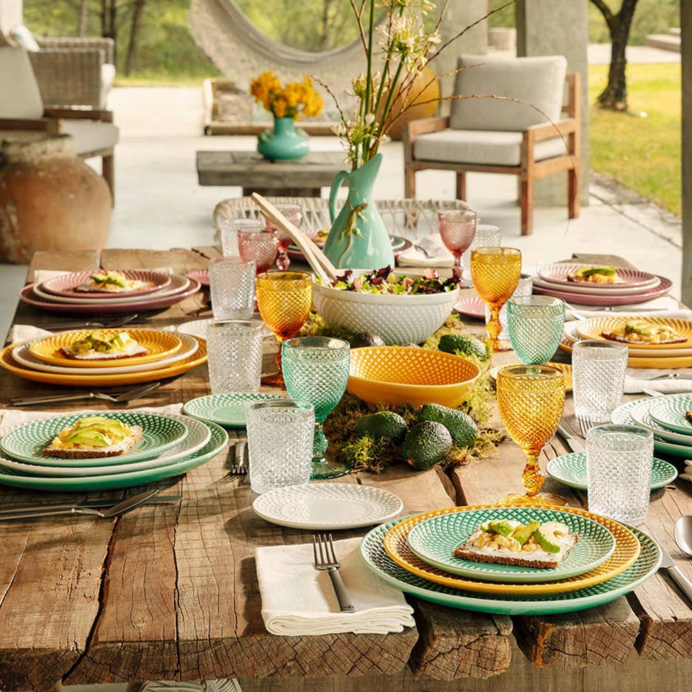 ルネッサンス時代から建築物の外装に用いられてきたダイヤモンドポイントからインスパイアされたBICOS。深みのある色彩とシャープなレリーフがテーブルを鮮やかに彩ります。VISTA ALEGREのBICOSグラス、BICOSポーセレンシリーズとのコーディネートもお楽しみください。