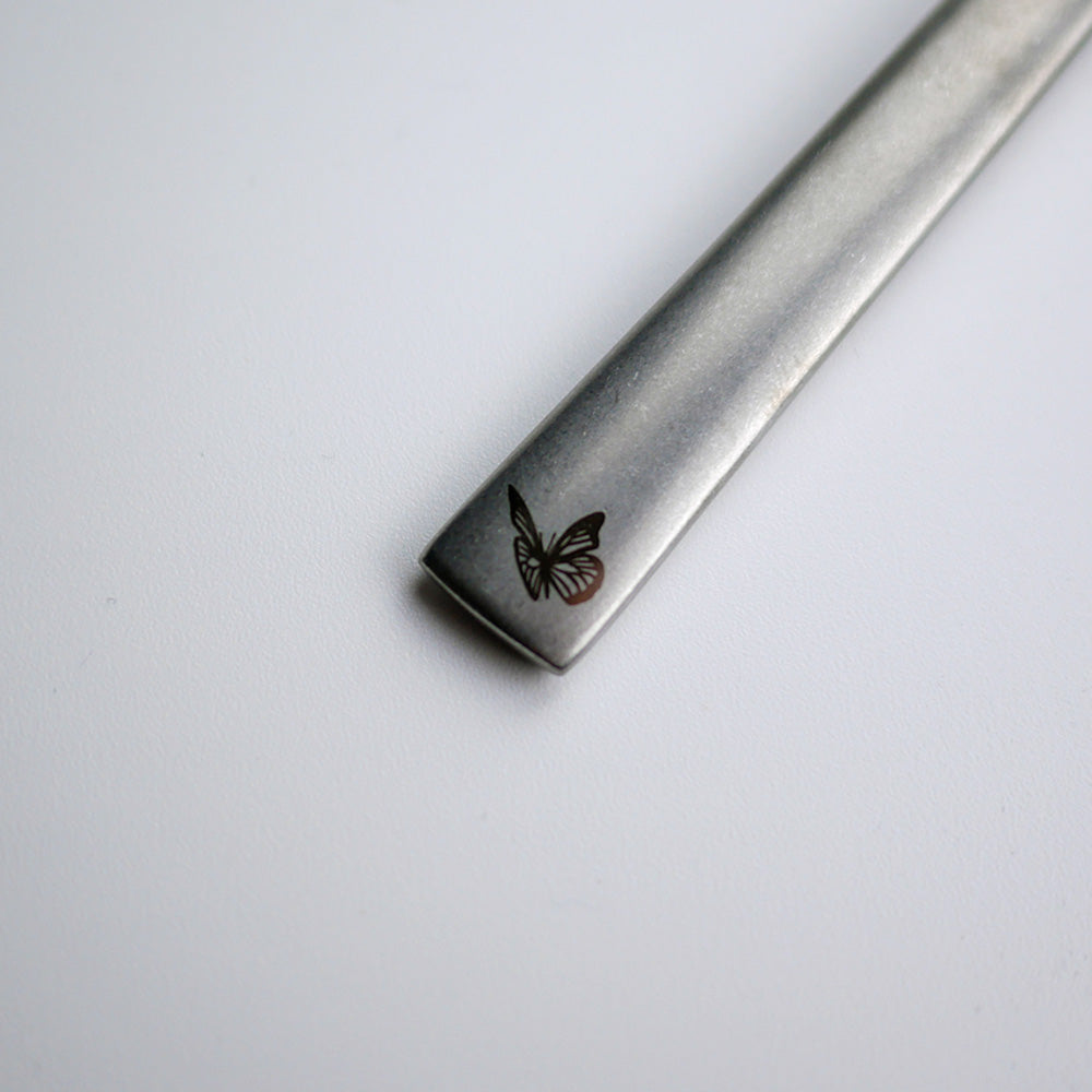 持ち手に刻まれた繊細な昆虫モチーフの装飾は、自然と共存する静かで調和のとれた田園風景へと私たちを誘います